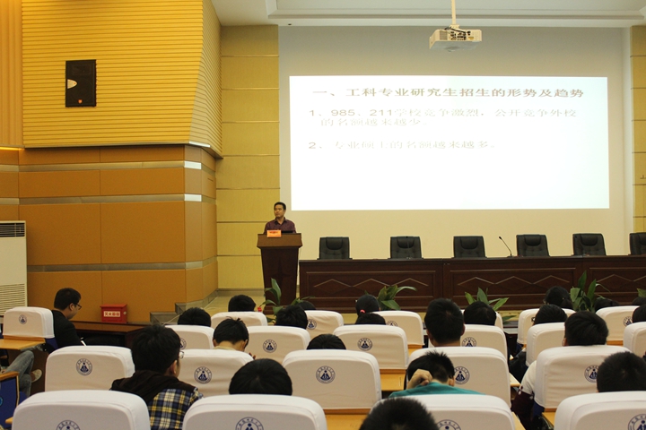 科研副院长郑贤锋从本、硕、博三个层次,学术体系、奖助学金体系两个体系出发,解答“大学生为什么考研?”这个问题,他指出考研是就业需要和个人需要的产物,希望同学们根据自身情况,准确定位好报考学校和报考专业。教学副院长丁绪星分析了近年来研究生招生的形式与趋势,通过对比“985、211”大学招生激烈和二三线本科竞争宽松两个现象,建议2016届毕业生区分开专硕和学硕,选择适合自己的专业。
