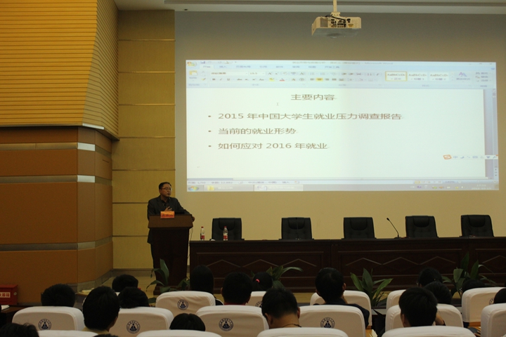 院党委副书记吴长义在认真解读《2015年中国大学生就业压力调查报告》的基础上,分析了当前的就业形势,并告诉学生如何应对2016年就业,他指出科学合理职业生涯规划是实现顺利就业的基础,转变观念是实现顺利就业的关键,拓宽求职渠道,改变求职方式是实现顺利就业的保证。最后他还鼓励毕业生响应国家号召进行创新创业。